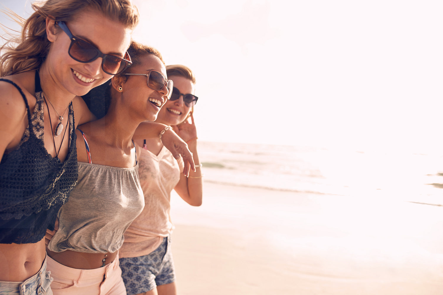 Group of beautiful young women strolling on a beach. Three friends walking on the beach and laughing on a summer day, enjoying vacation.