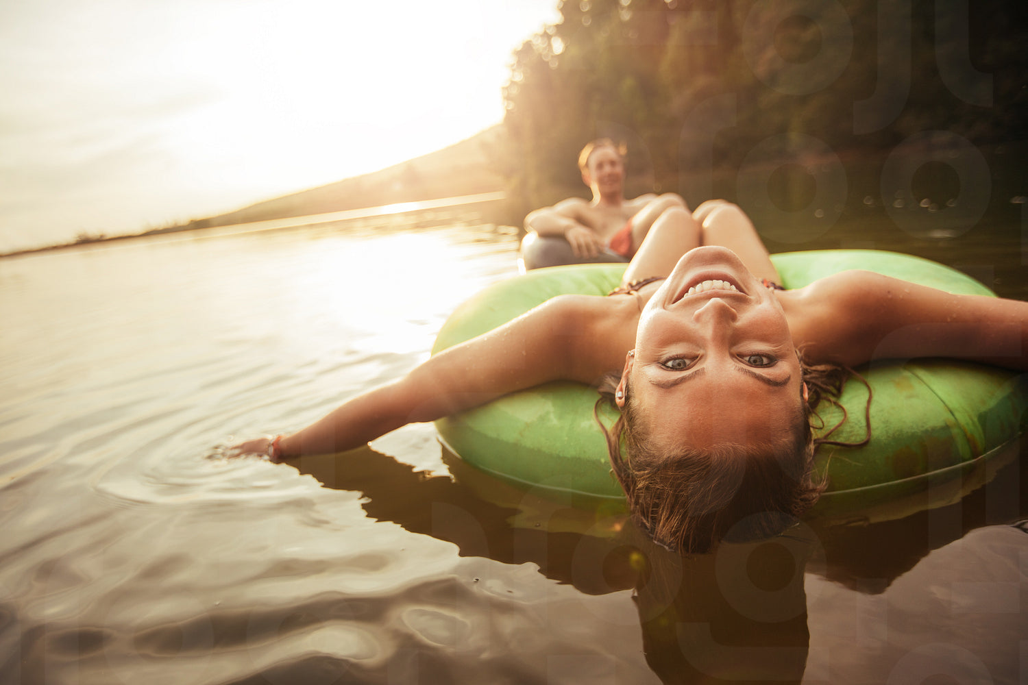 Portrait of happy young woman floating in an innertube with her boyfriend in background at the lake. Young couple in lake on inflatable rings.