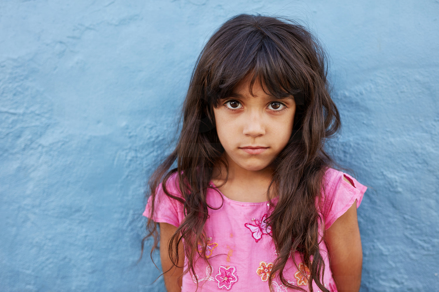 Close up portrait of innocent little girl standing against blue wall, she is looking at camera with serious expression on her face.