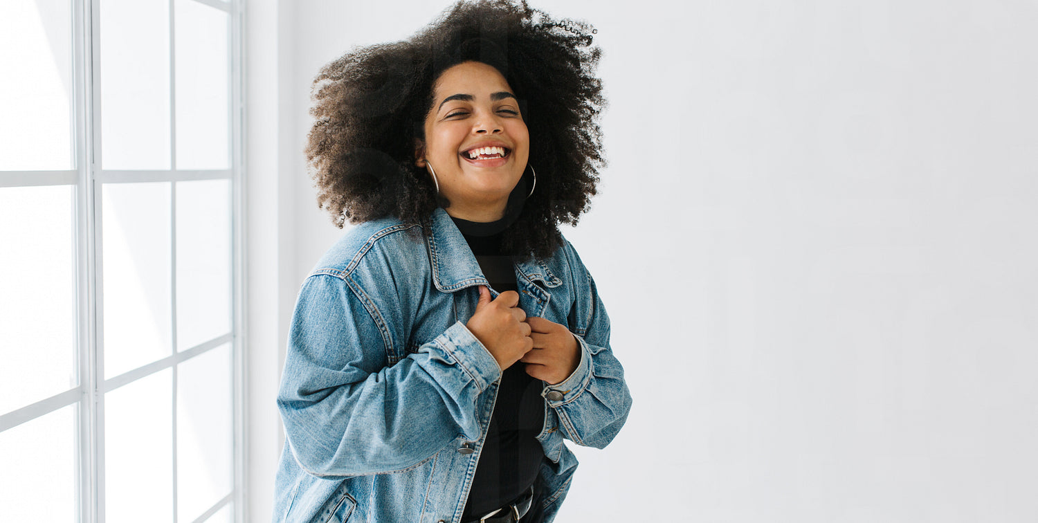 Beautiful woman wearing denim shirt over casual outfit standing near window. Pretty lady in fashionable clothing standing.