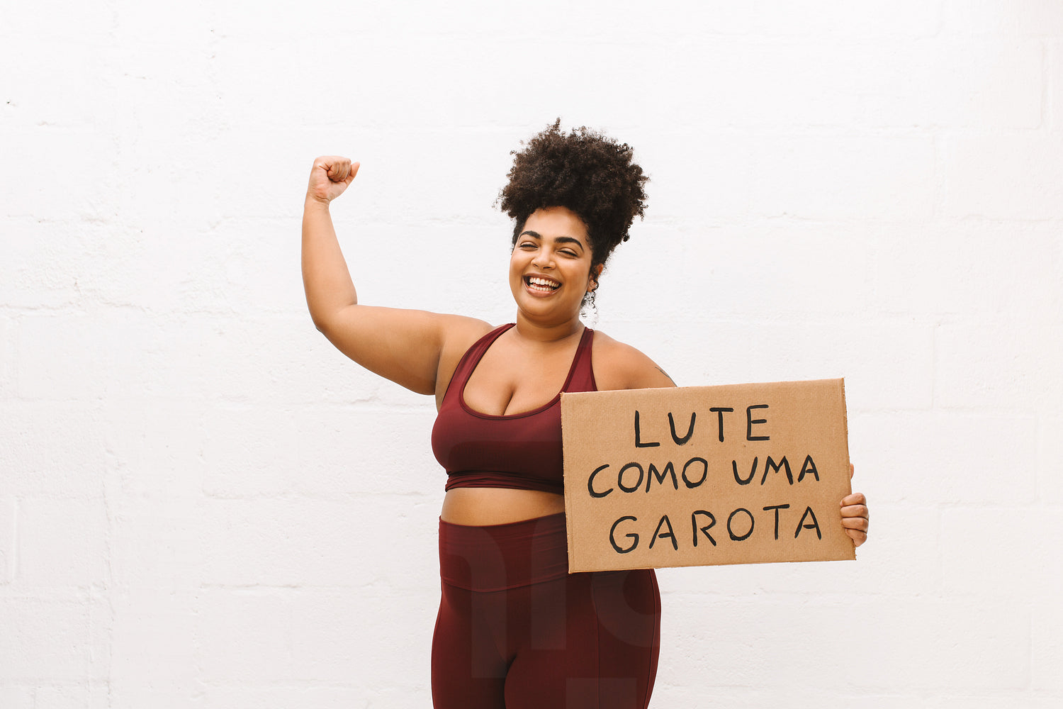 Attractive female showing her arm and holding brown board of "Fight like a girl" phrase in portuguese language. Woman in exercise outfit standing against white background.
