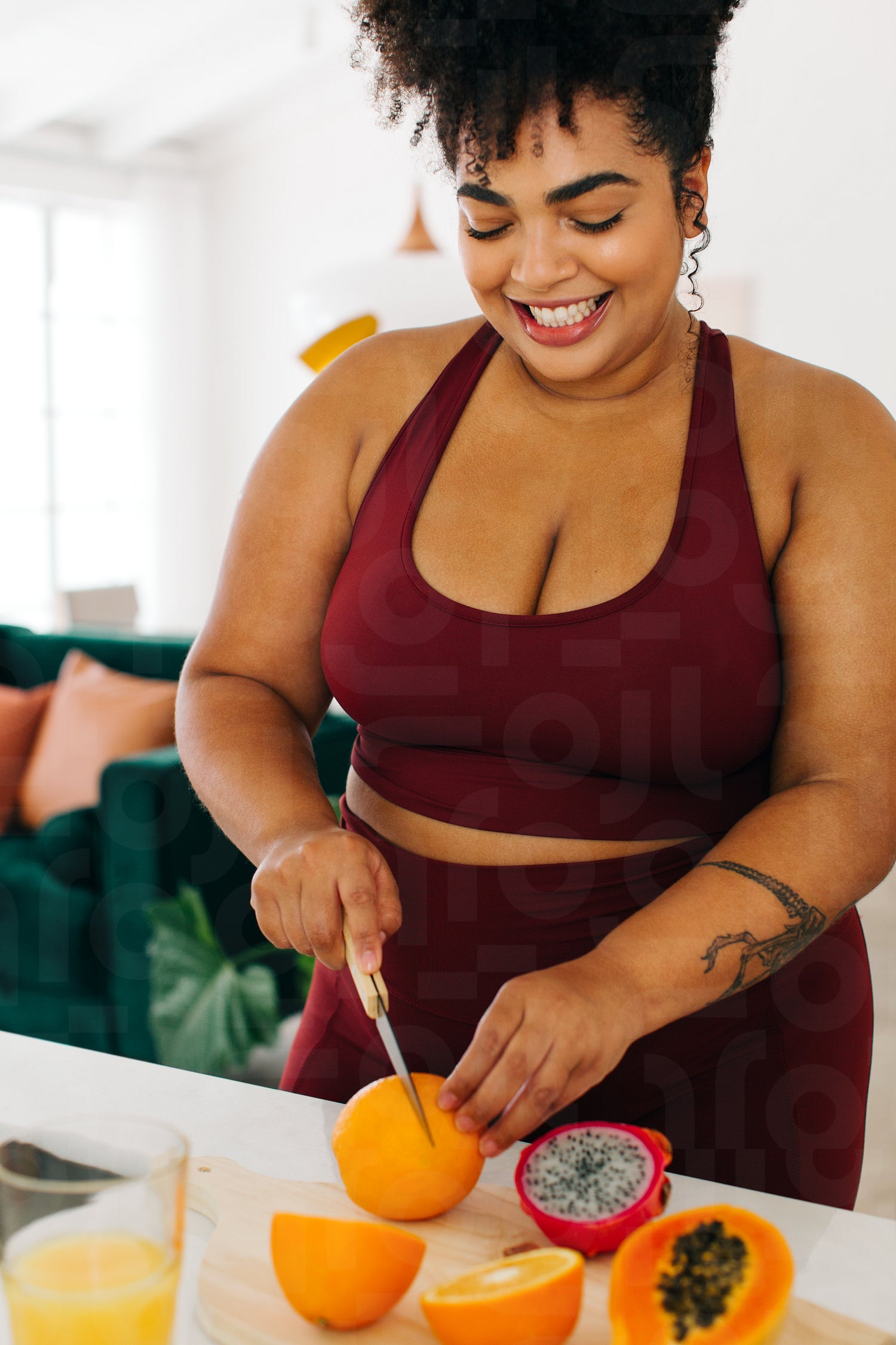 Beautiful female making healthy juice in kitchen. Fitness woman cutting fruits for preparing juice at home.