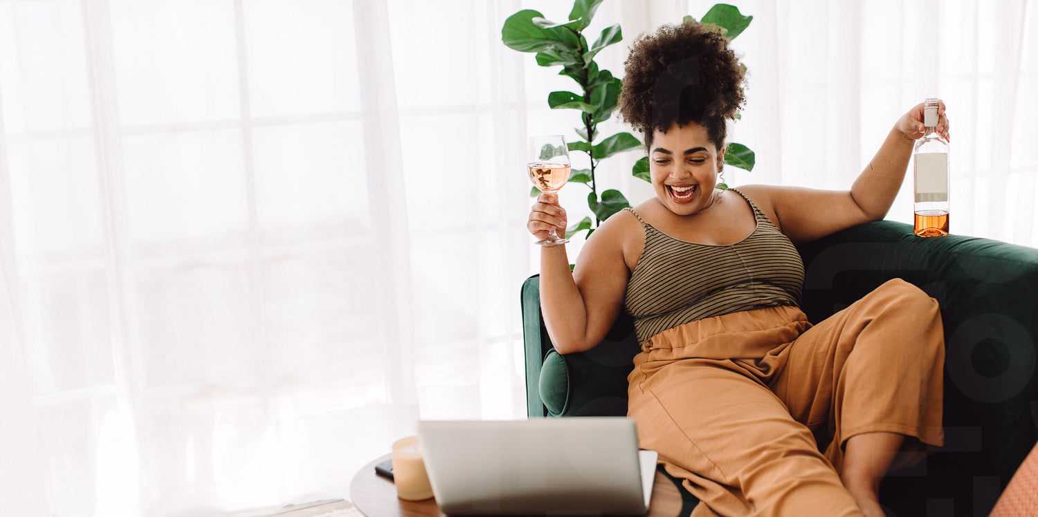 Woman raising a wine glass on video call. Happy woman celebrating with family and friends on video call using a laptop. Virtual happy hour.