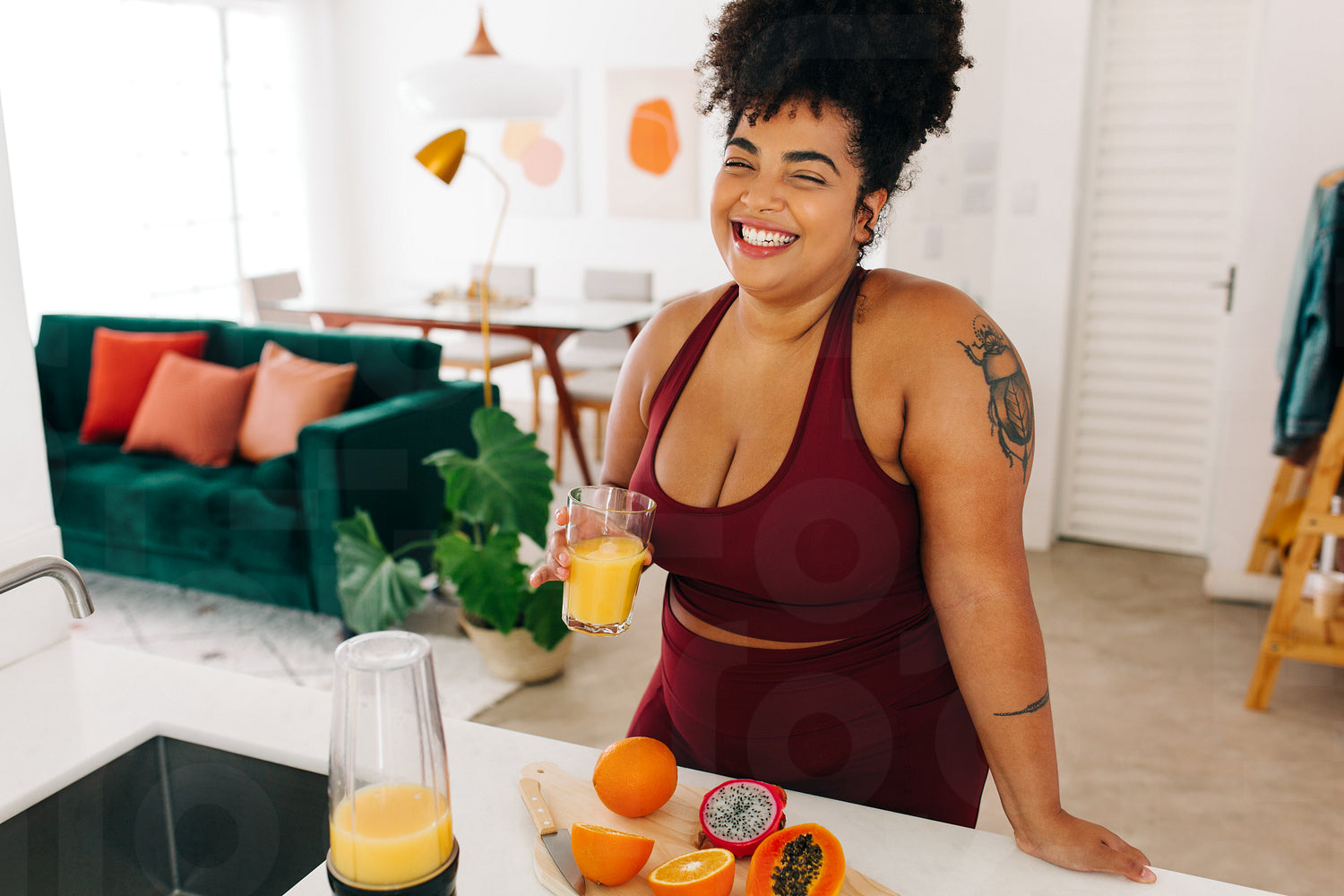 Happy female holding glass of fresh fruit juice while standing at kitchen. Woman in sports clothing having fruit juice at home.