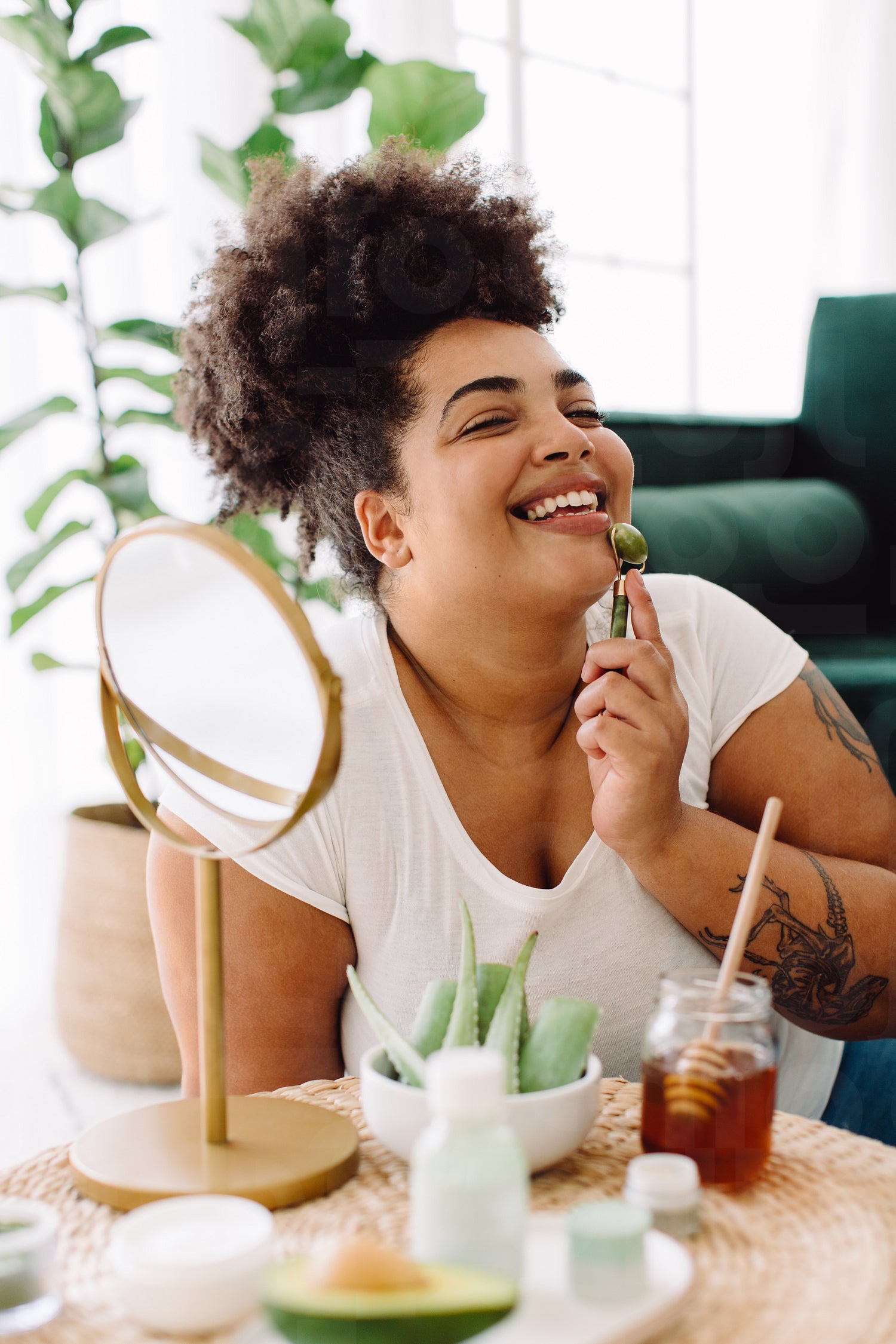 Attractive woman sitting in living room and using beauty care tools on face. Young female taking care of her facial skin at home.