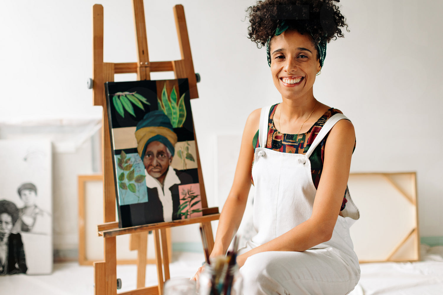 Carefre female painter smiling in her studio. Happy young painter looking at the camera while sitting next to her artwork. Cheerful young woman working on a new painting in her art studio.