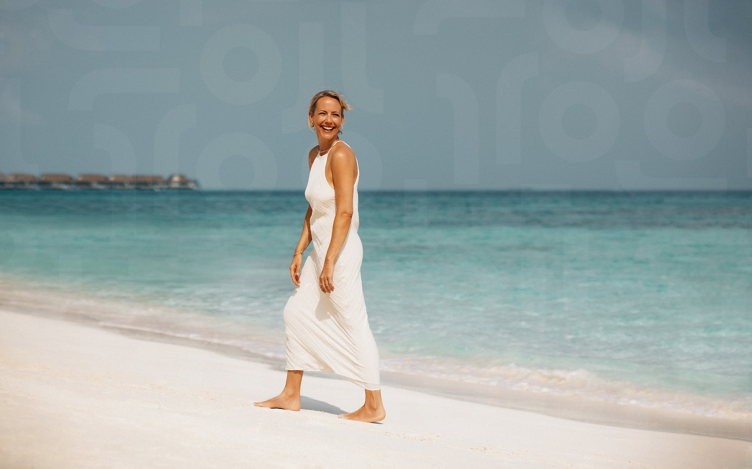 A cheerful woman in a white dress strolls along a tropical beach under sunny skies, radiating joy and relaxation near the ocean's edge.