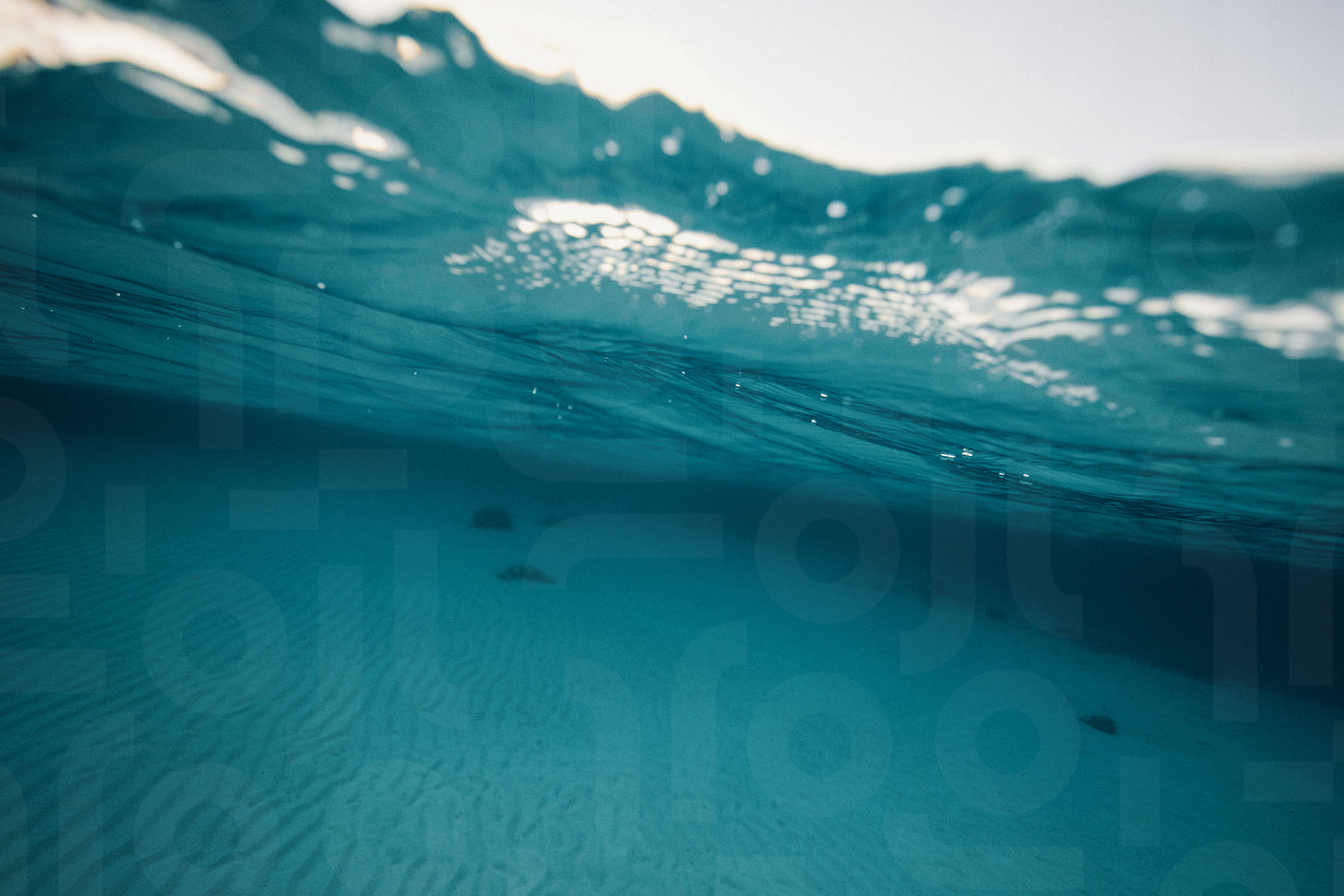 Underwater shot of blue ocean waves showing the seafloor and sand. Peaceful view of clear blue water.