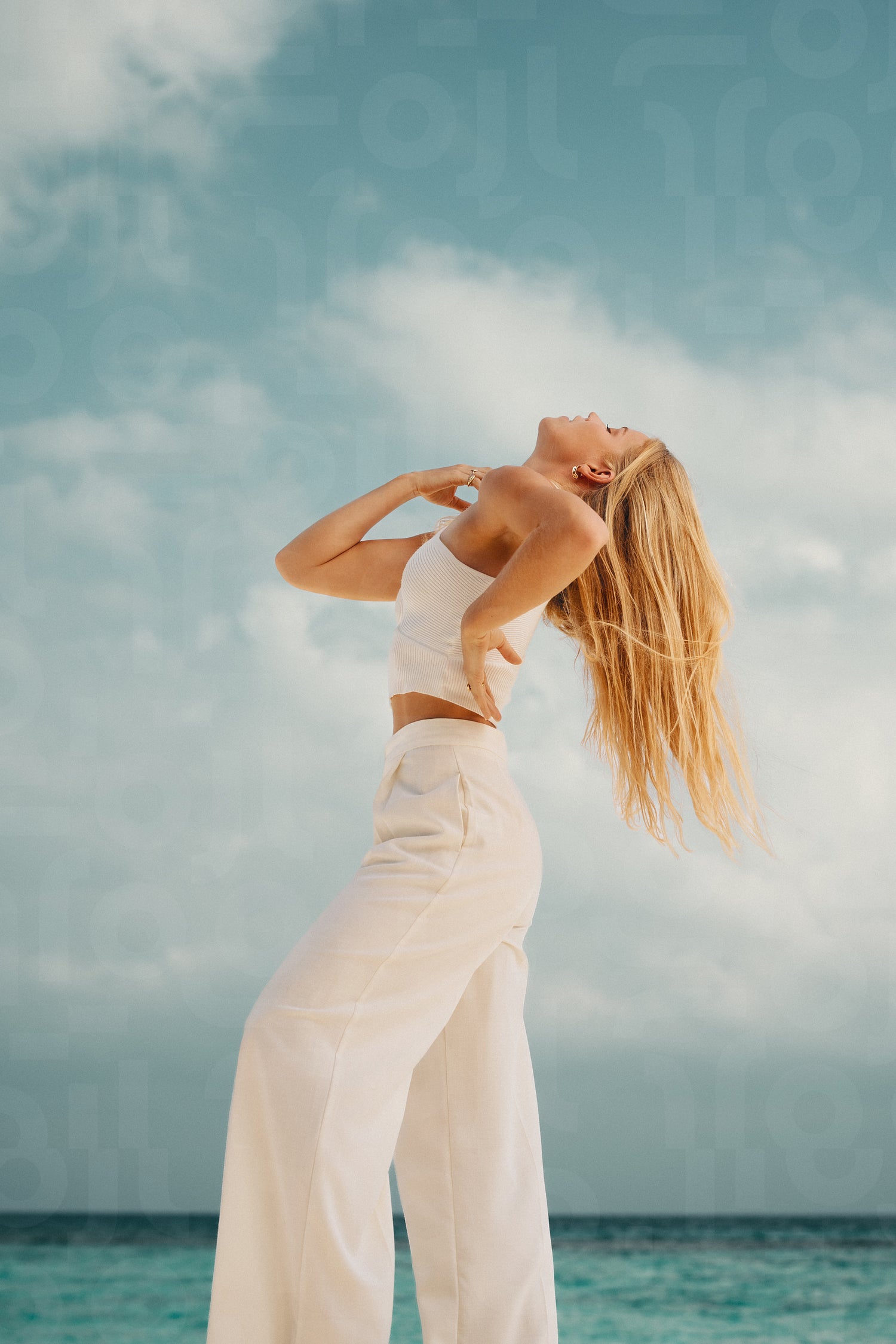 A fashionable woman dressed in white enjoys the serene ambiance of the ocean under a clear sky, portraying themes of elegance, freedom, and natural beauty.