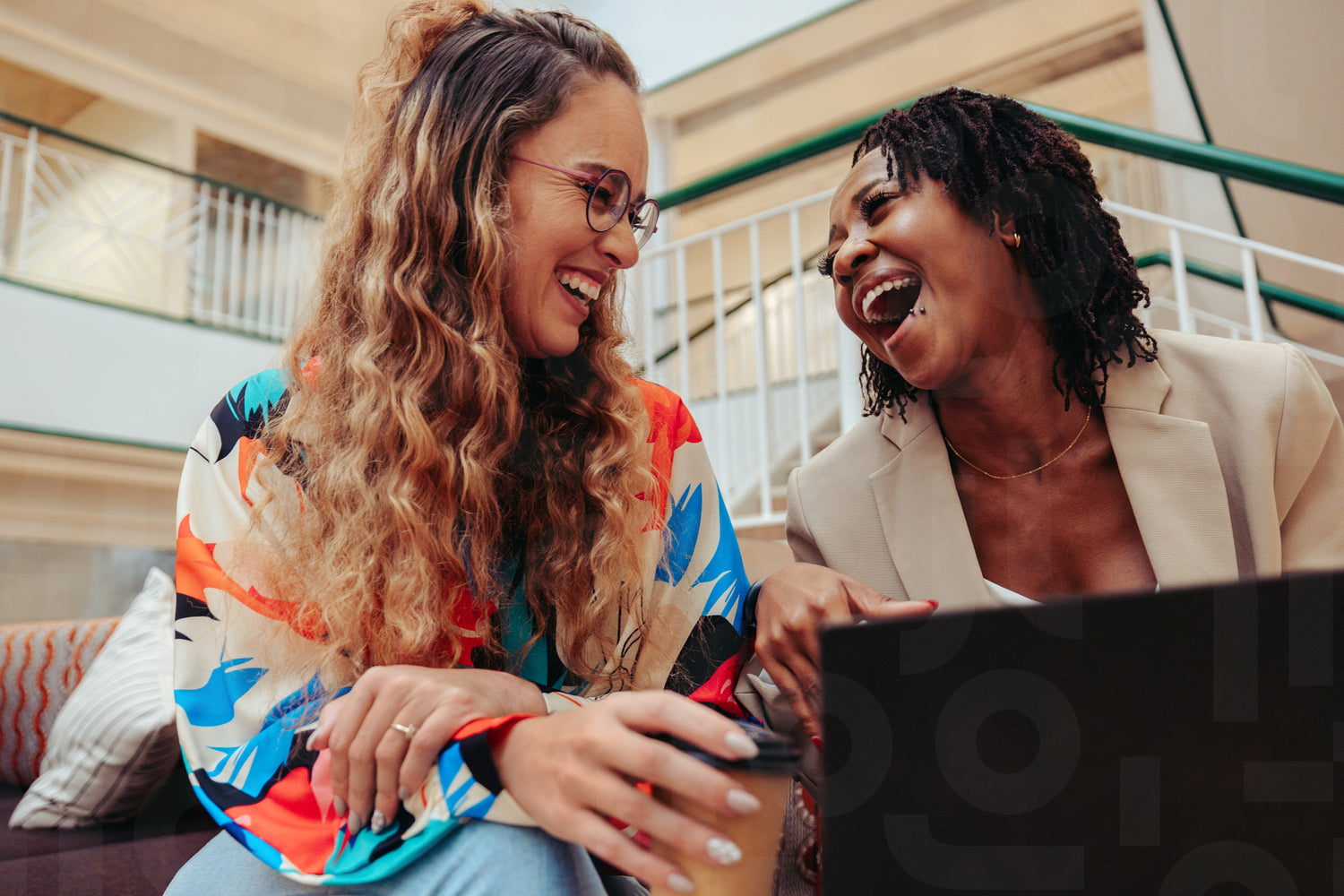 Two young colleagues share a hearty laugh while working together in a modern office environment. Their joyful expressions convey the positive and collaborative spirit of their workplace.