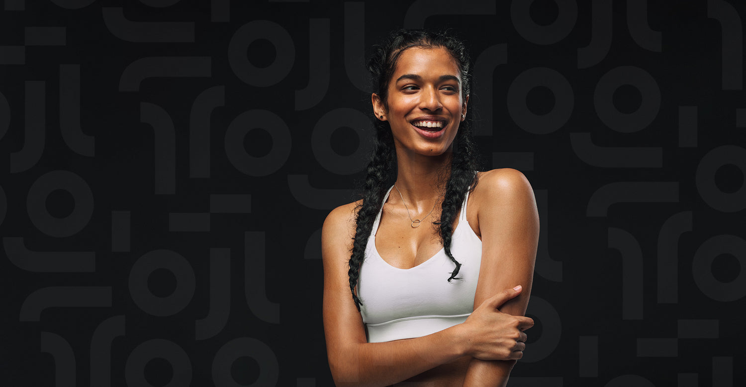 Portrait of smiling fit woman. Sportswoman standing on black background and looking away.