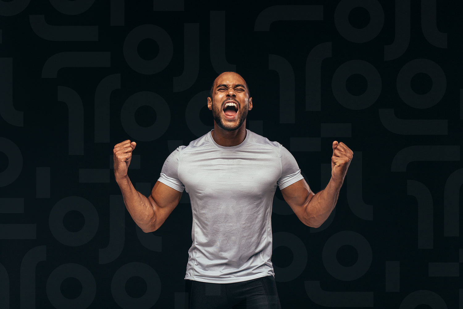 Monochrome portrait of muscular athlete celebrating. African american sportsman shouting with closed fists.