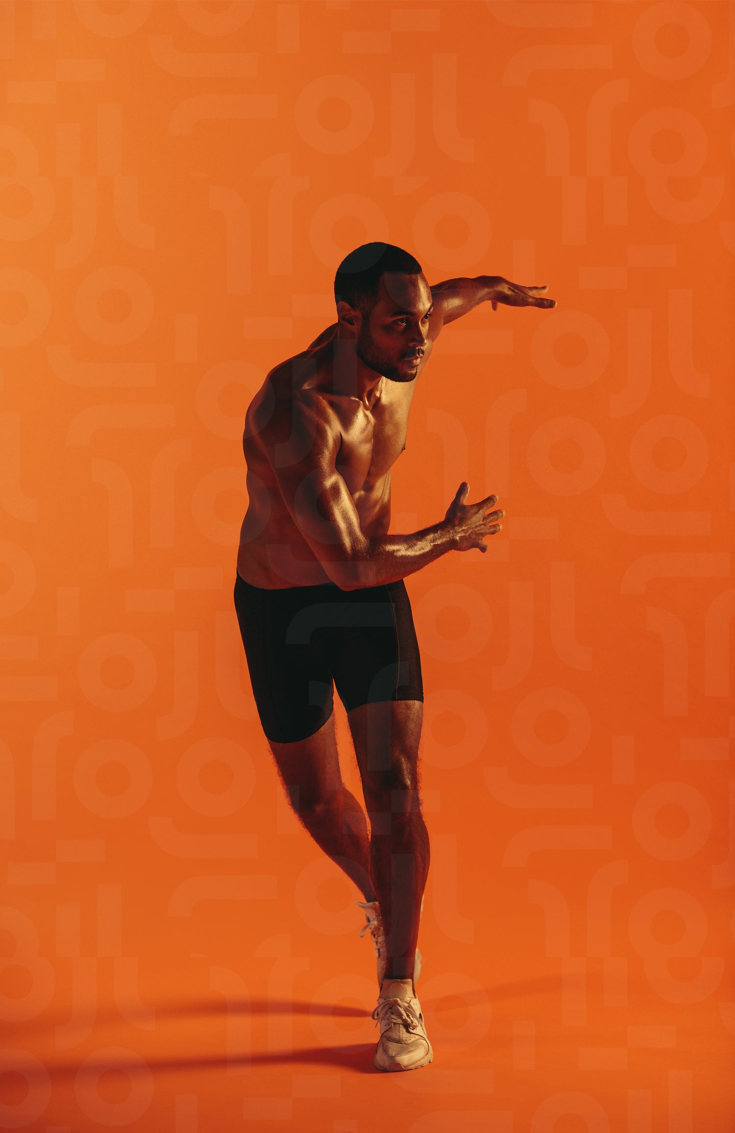 Full length portrait of bare chested athletic man doing fitness exercises. African american man working out on orange background.