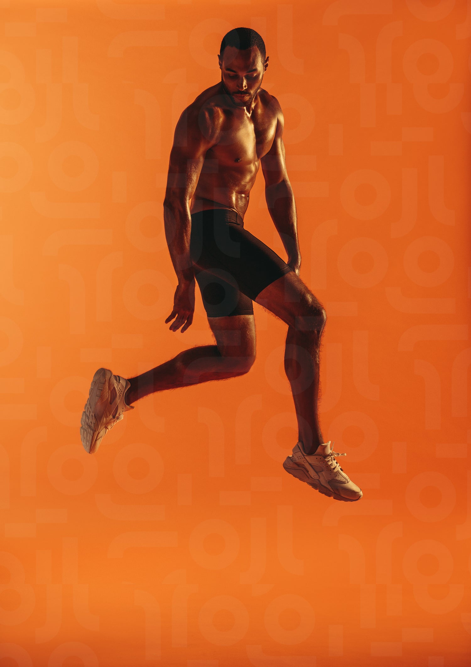 Athletic man jumping in air while working out on orange background. Monochrome fitness portrait of muscular athlete doing workout.