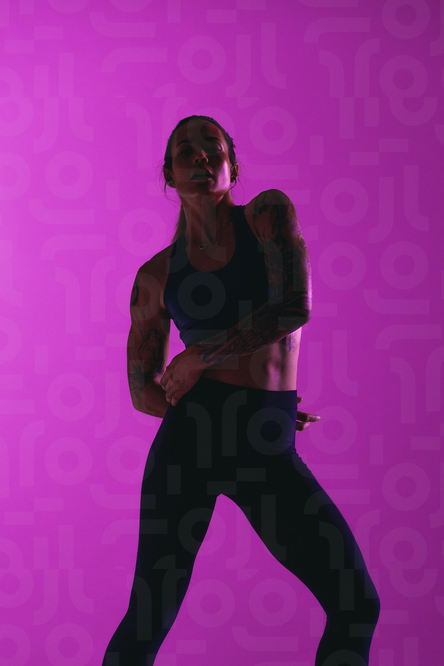 Monochrome fitness portrait of fit woman athlete. Woman in fitness wear working out on purple background.