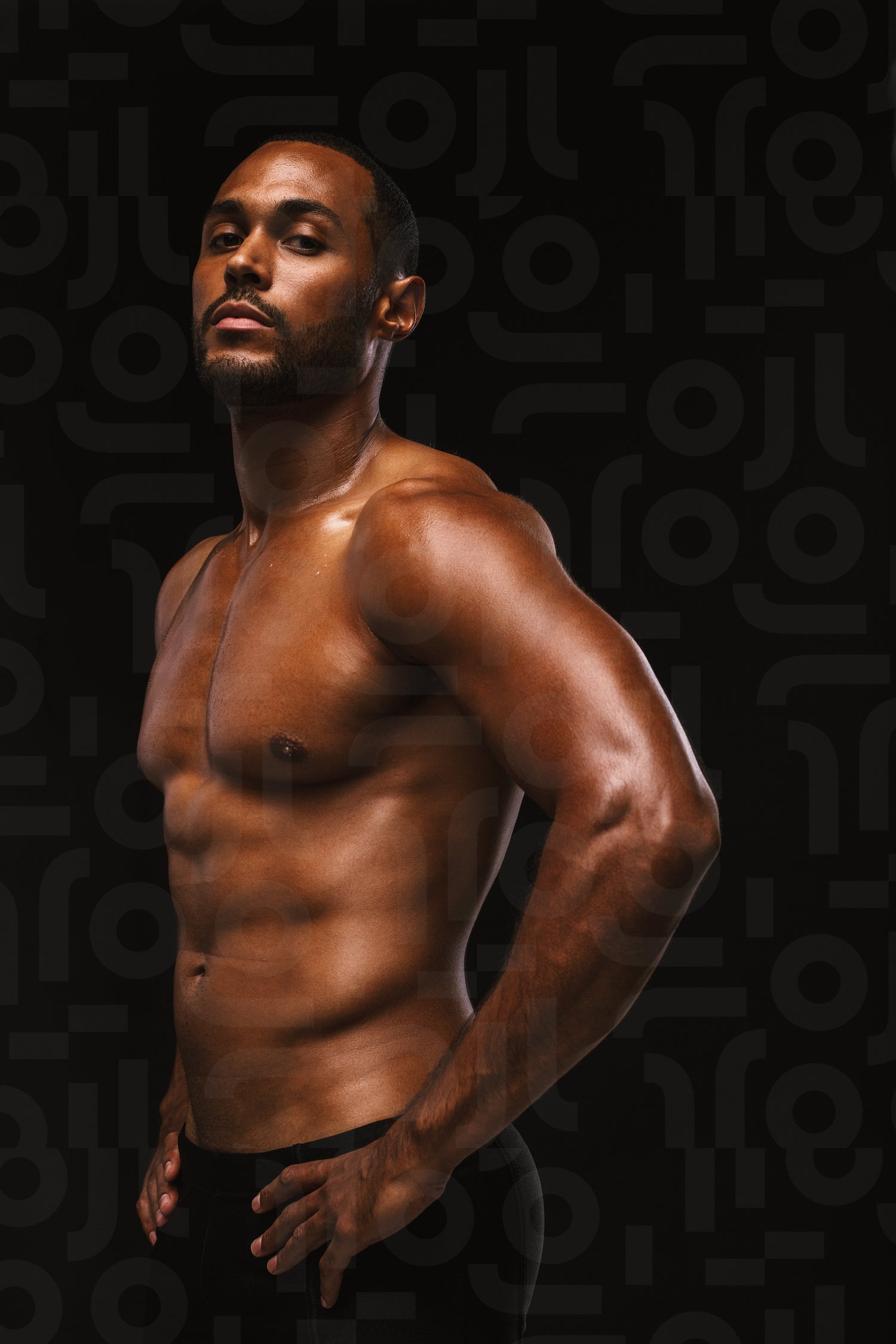 Close up portrait of muscular african american athlete. Side view of fit man standing on black background with hands on waist.