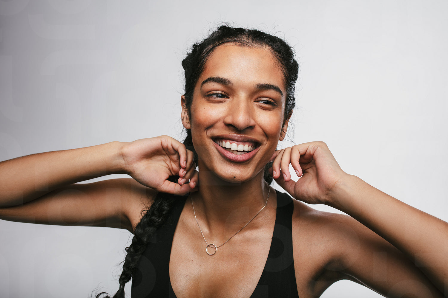 Close up of smiling female athlete on white background. Fit woman in sportswear smiling.