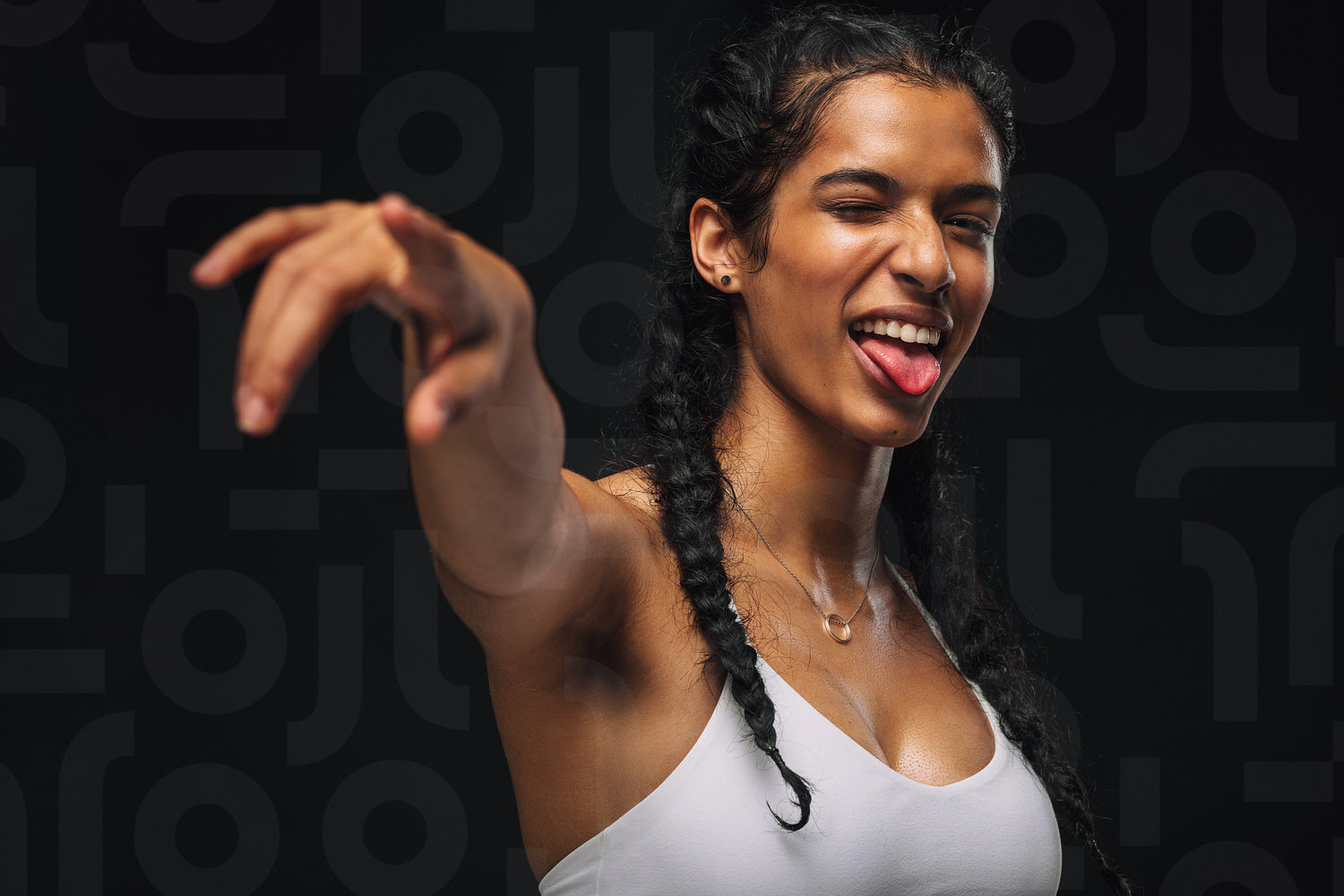 Close up portrait of a fitness woman sticking her tongue out. Woman in white fitness wear making pointing gesture.