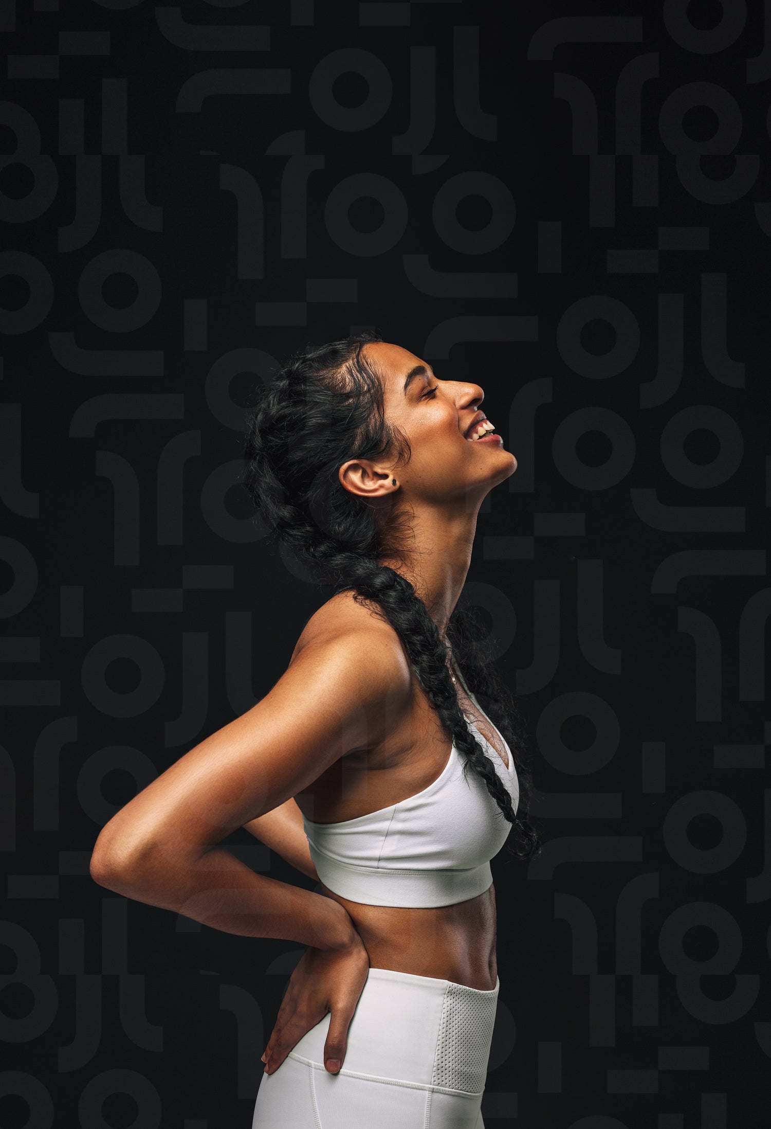 Portrait of a female athlete on black background. Smiling fit woman relaxing after workout.