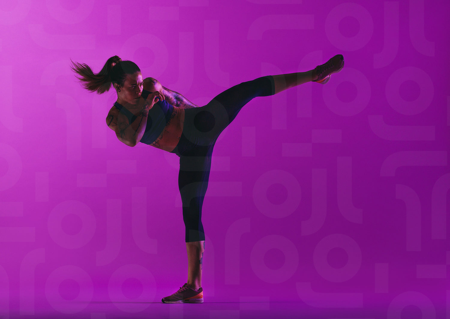 Female athlete doing fitness workout. Muscular woman balancing on one leg practising kicks.