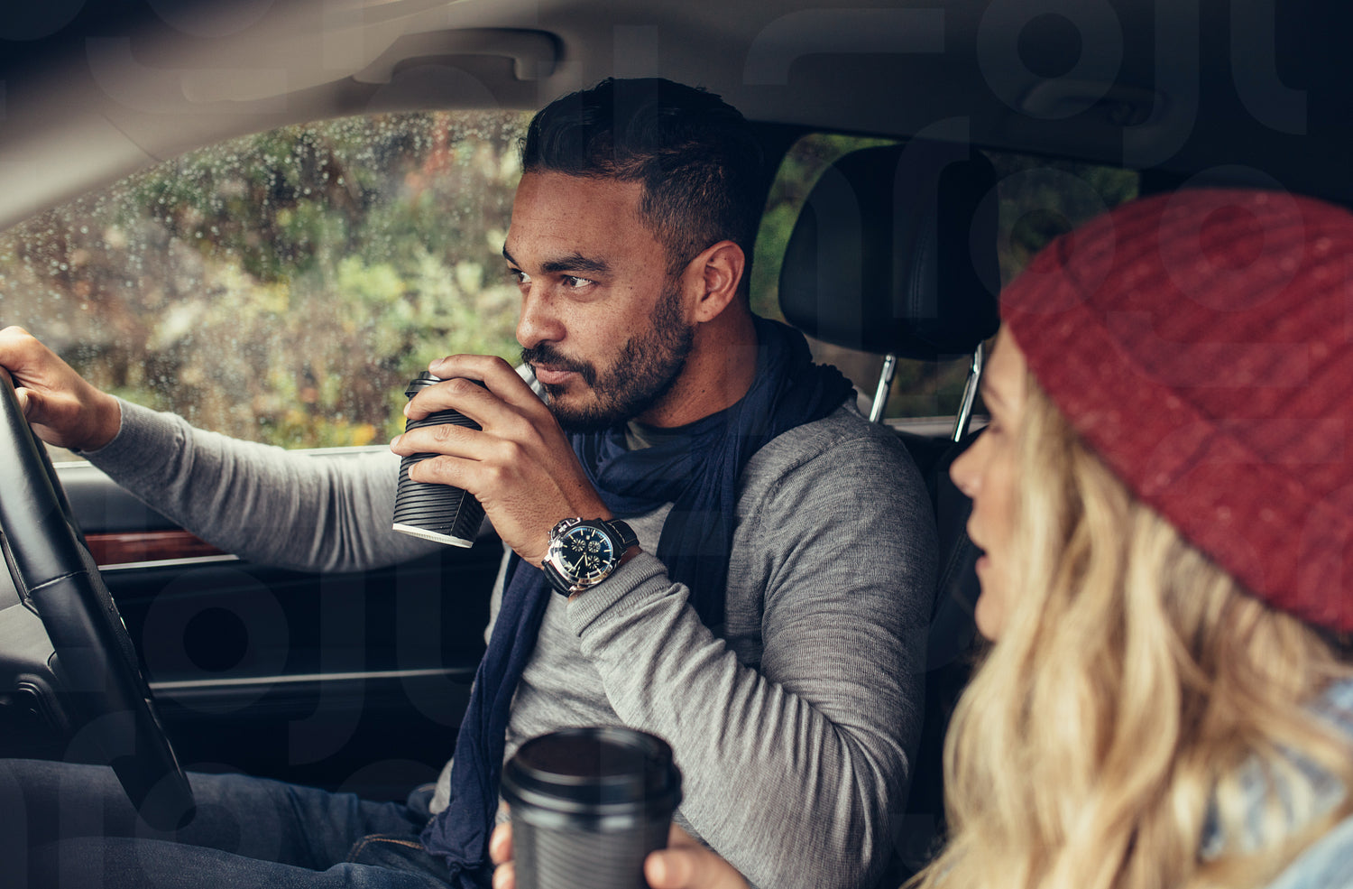 Young man and woman traveling by car and having coffee. Couple drinking coffee while driving a car.