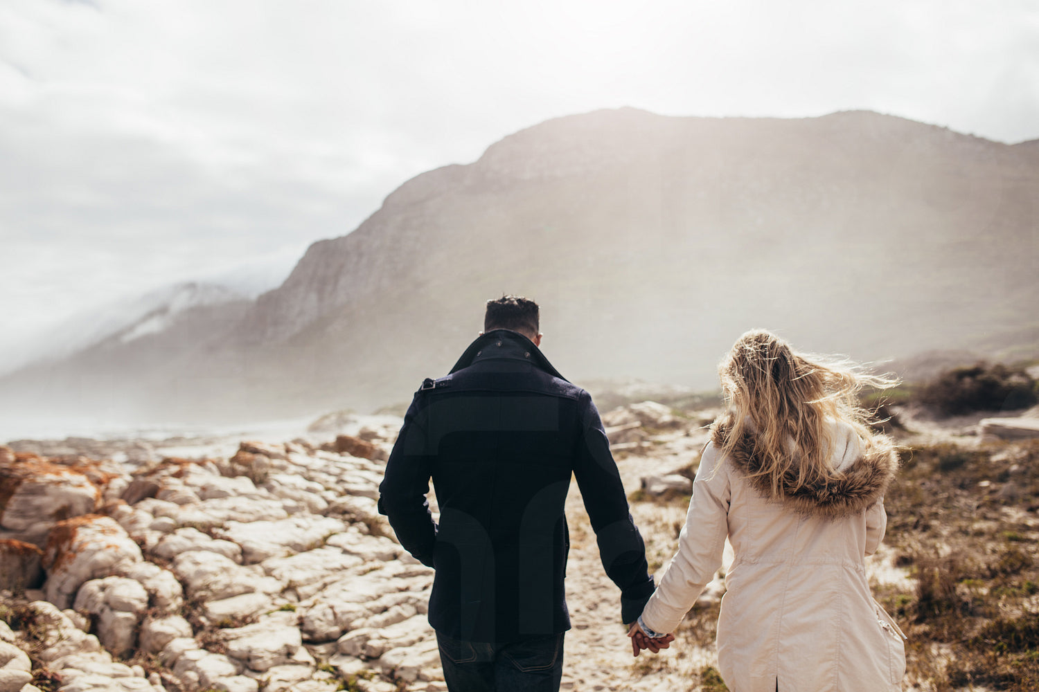 Rear view of couple holding hands and walking through the rocky coastline on a winter day. Man and woman strolling at the seaside during winter vacation.
