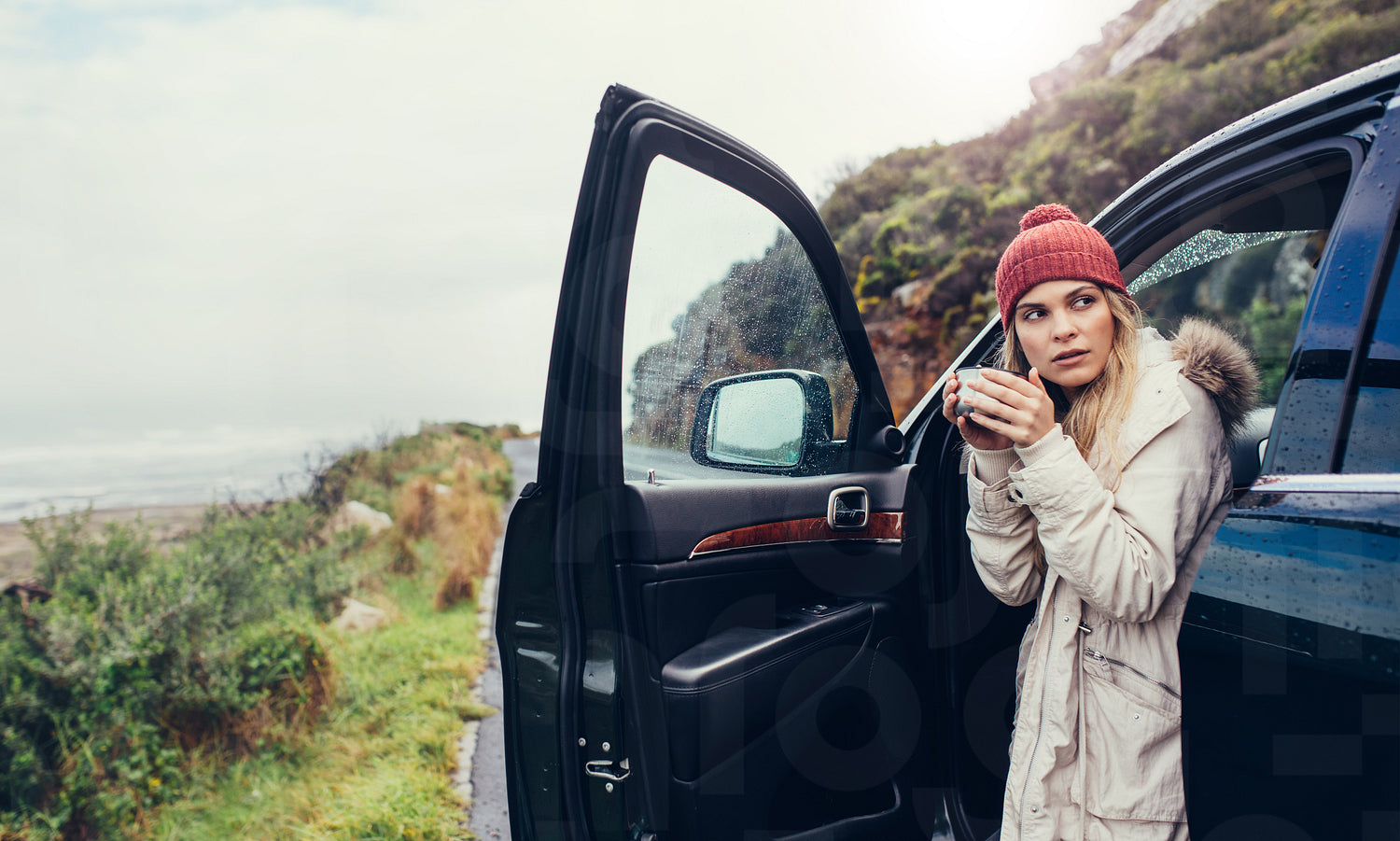 Beautiful young woman standing out her car with cup of coffee and looking away. Female drinking coffee after road trip travel.