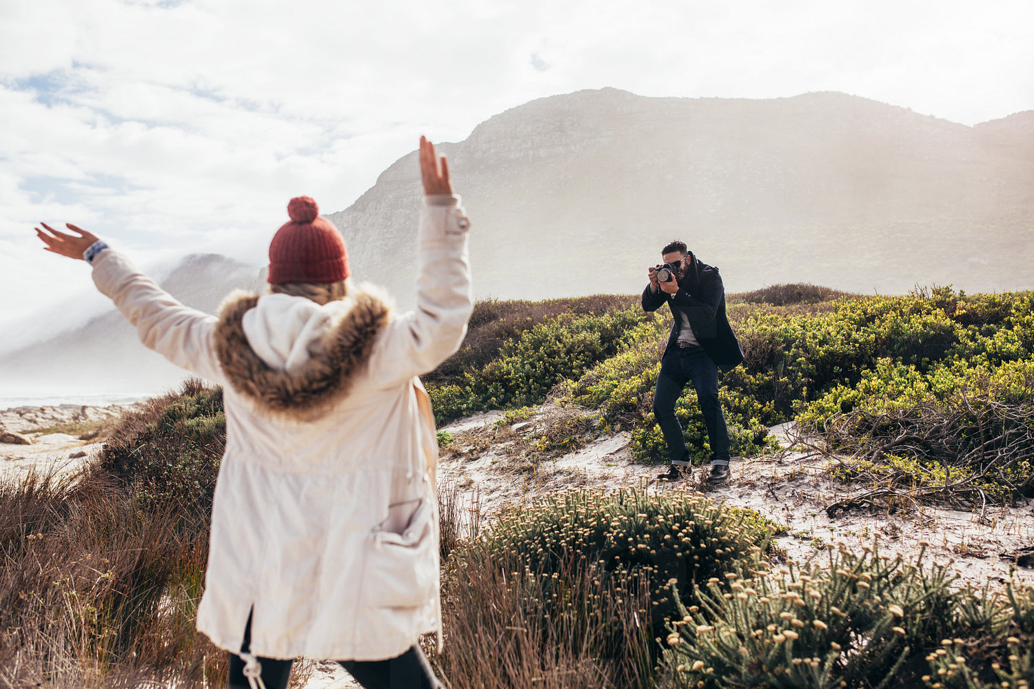 Young man taking a pictures of his girlfriend standing outdoors with arms raised. Couple on beach taking photographs with digital camera.