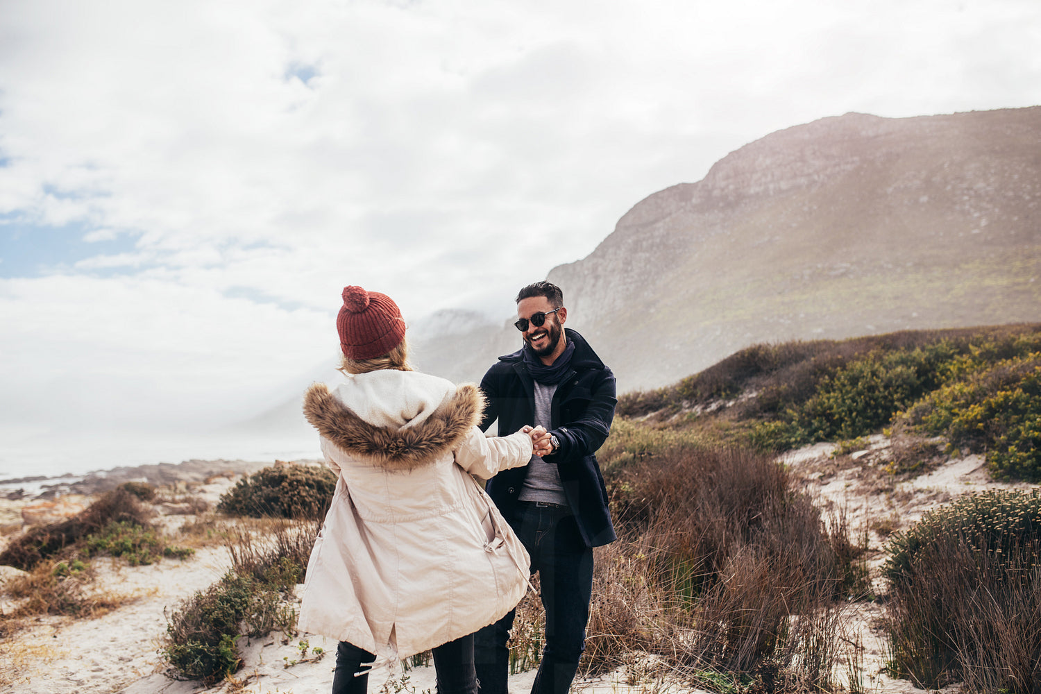 Happy couple enjoying themselves during winter vacation outdoors. Romantic couple dancing outdoors on the beach.