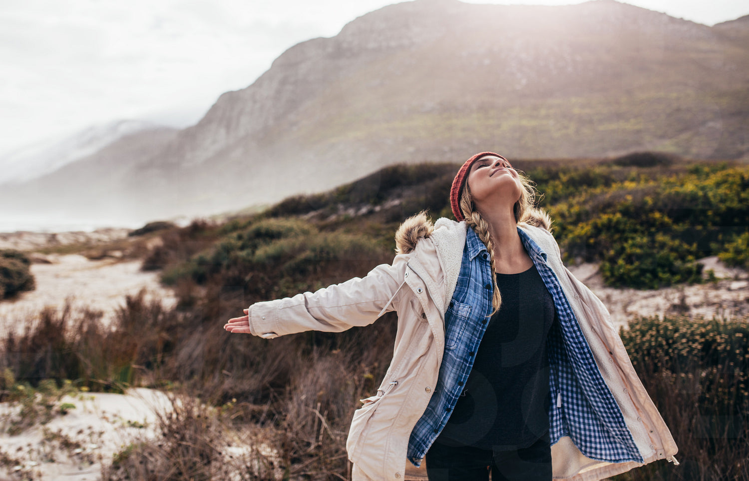Beautiful young woman enjoying a winter day on the beach. Joyful woman standing on a cold winter's beach with her arms outstretched and her eyes closed happily breathing in the fresh sea air.