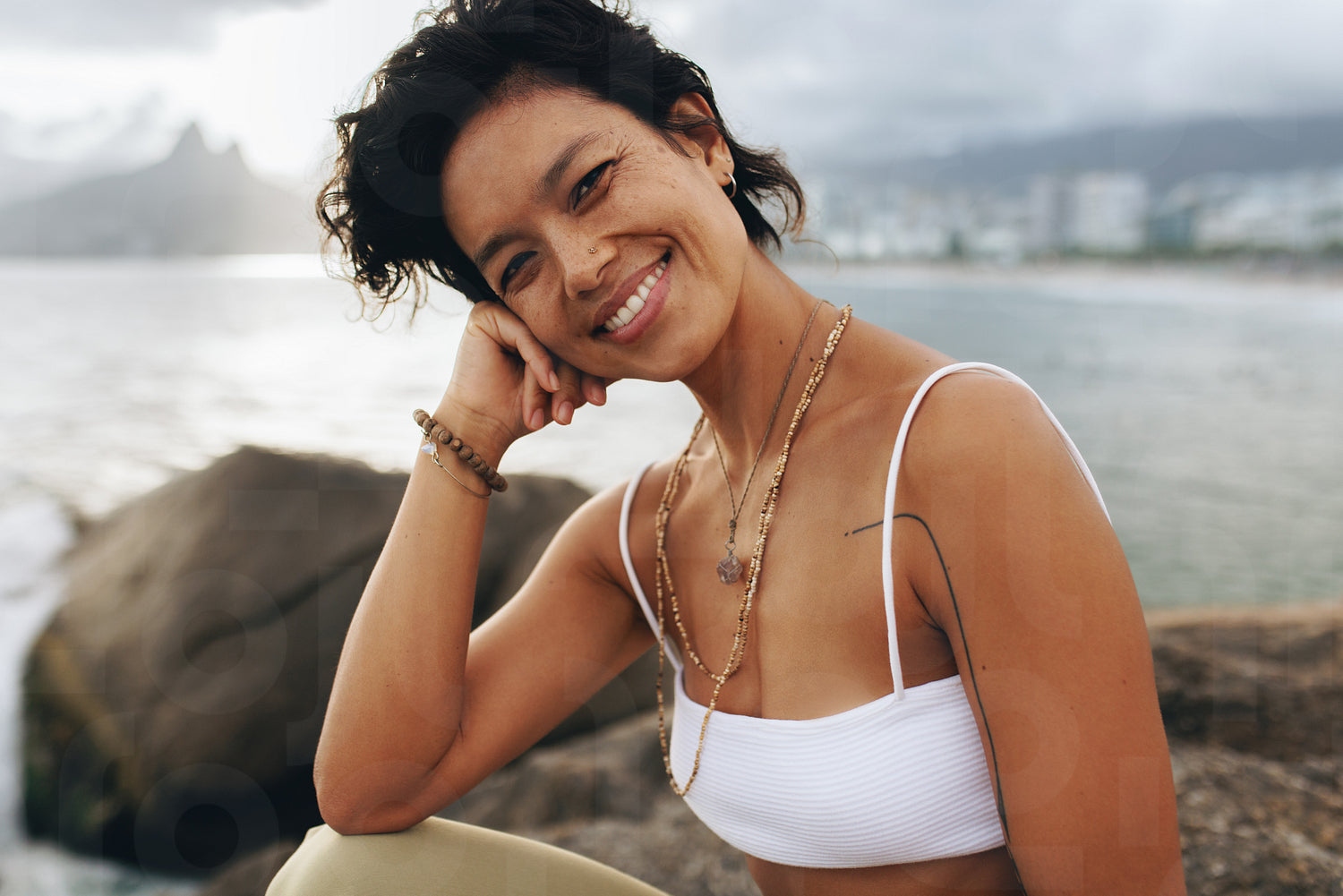 A beautiful woman with tan skin poses on the beach, showcasing her bohemian jewelry during a seaside vacation.