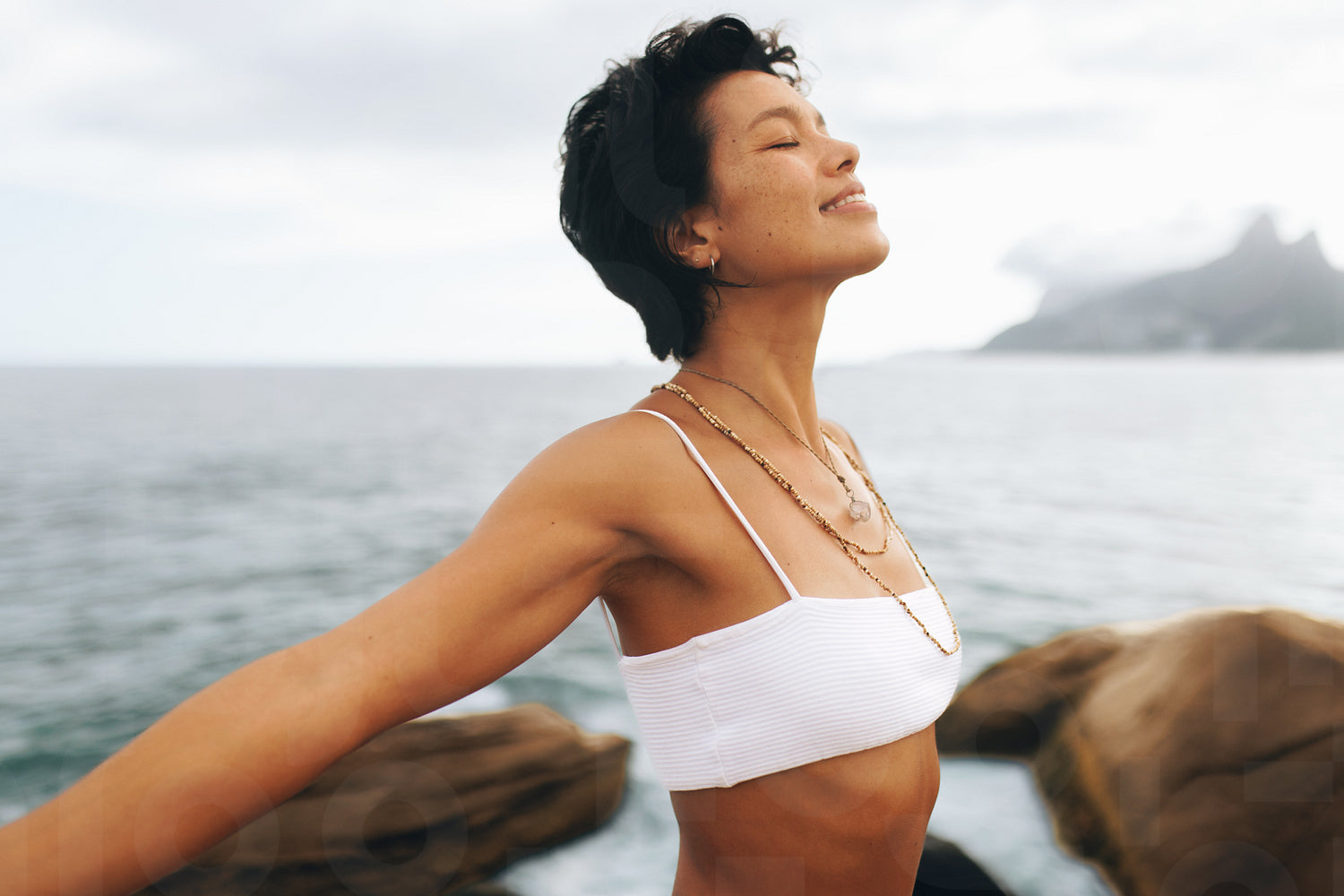 Carefree woman in bohemian jewelry enjoys peace and joy at seaside beach