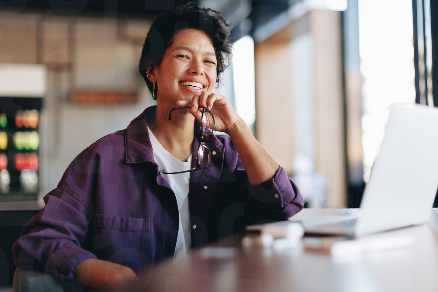 Smiling entrepreneur and freelancer working on a laptop in a cafe. Happy businesswoman enjoying coffee while working on a startup project.