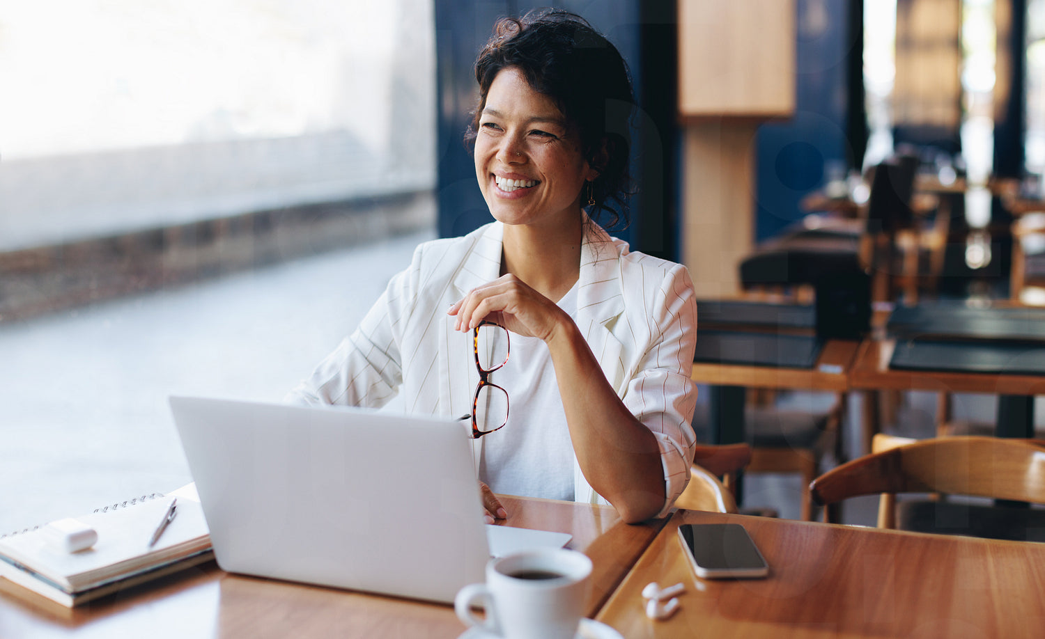 Happy businesswoman working on her laptop in a cafe. Professional freelancer enjoys her work while using a laptop and glasses in a comfortable cafe setting.