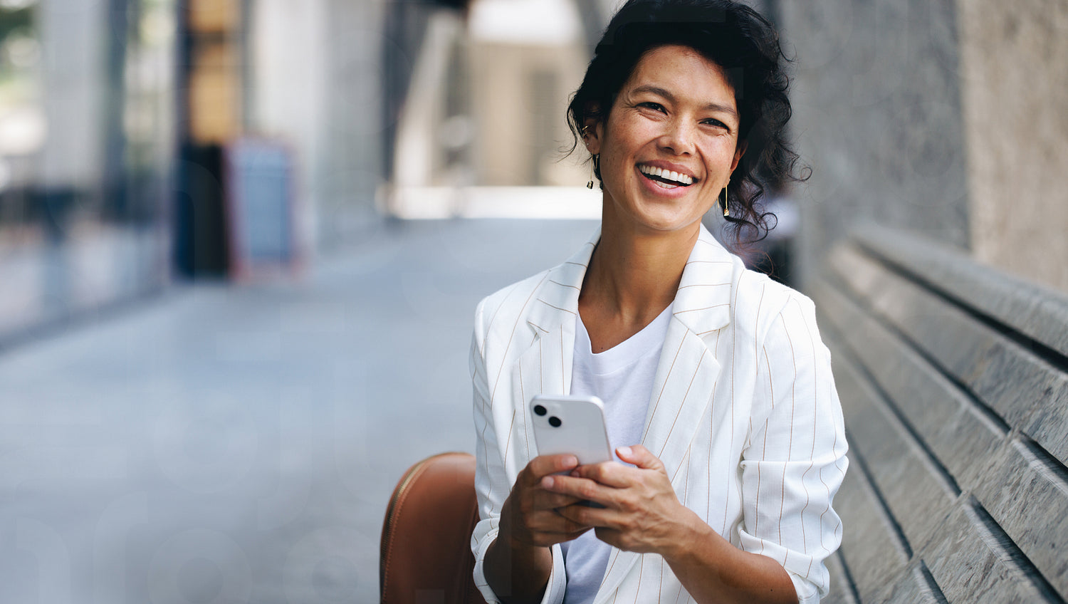 A joyful woman sitting on a bench, happily texting on her smartphone. She is visibly happy and engaged with social media.