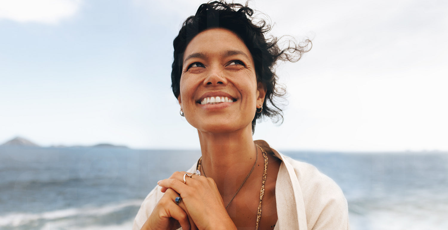 Joyful smiling woman with wavy hair and bohemian jewelry posing in a close-up portrait at the seaside on a windy day.