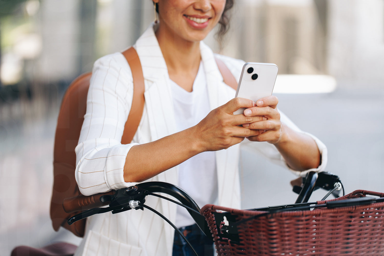 A smiling woman rides a bike with a basket on an urban street, using her smartphone for social media.