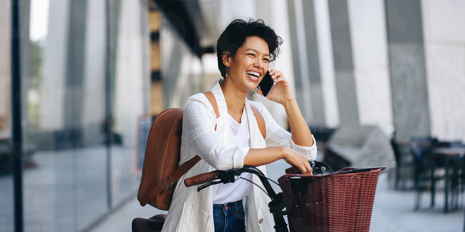 Smiling woman talking on the phone while leaning on a bicycle in a urban setting