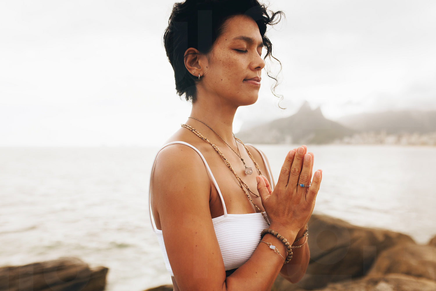 Close-up portrait of a woman with wavy hair and bohemian jewelry in a yoga pose meditating by the seaside