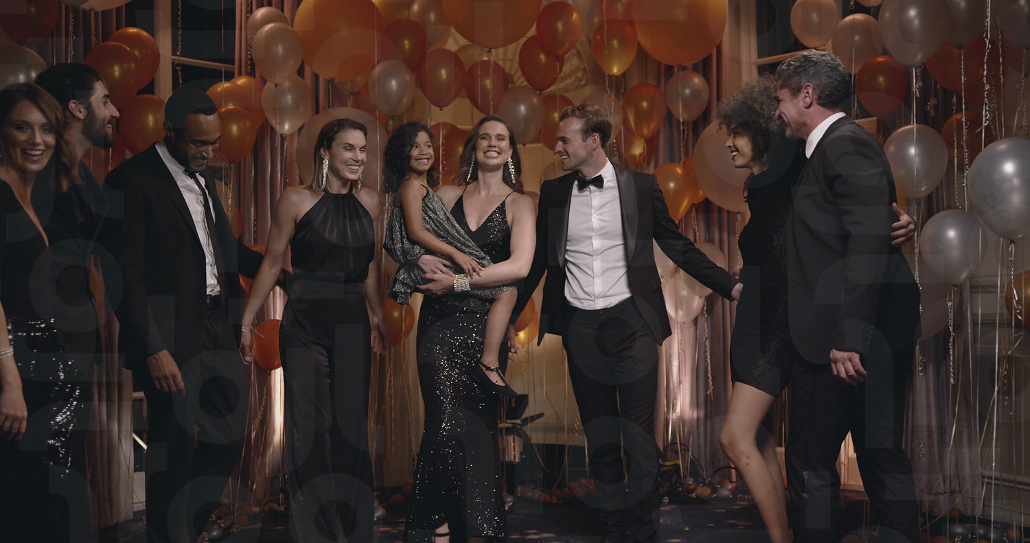 Family and friends having a group photo at gala night party place decorated with balloons. Group of men and women with a girl standing together and looking at camera.