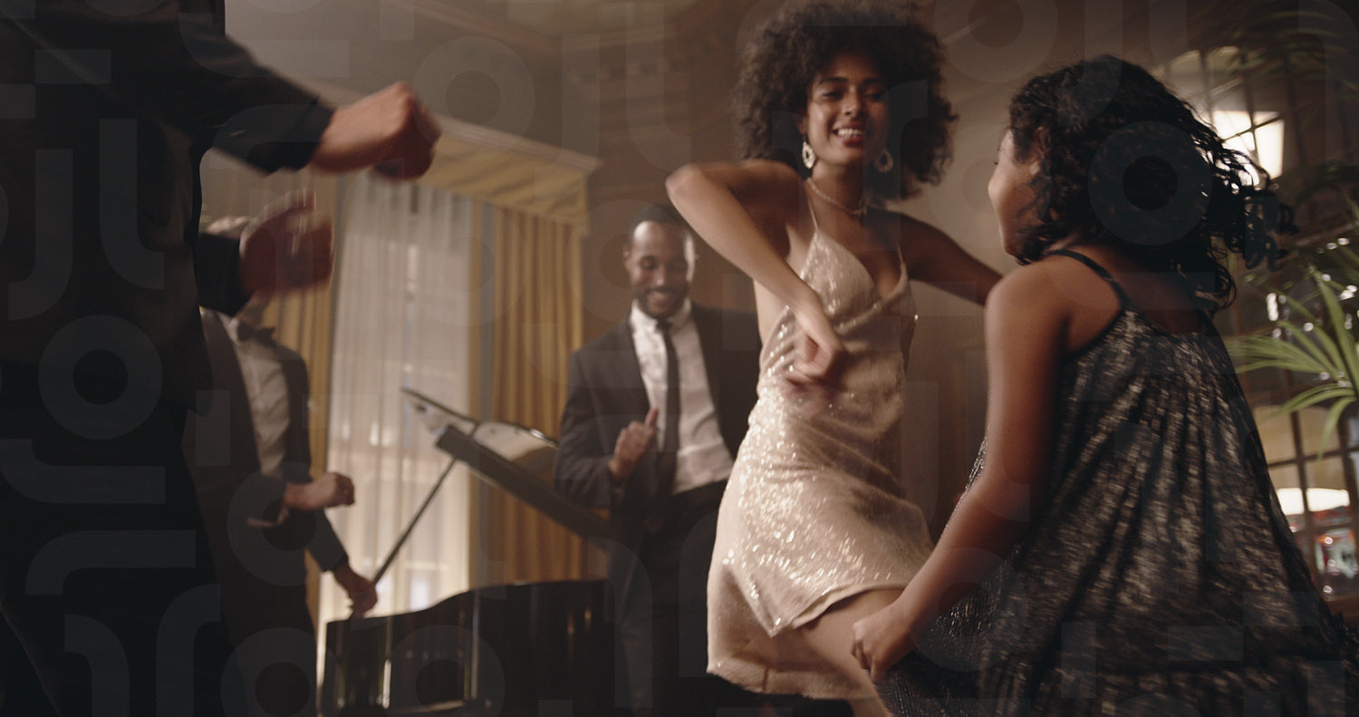 Mother and daughter dancing and having fun at a party with people dancing around them. Beautiful african woman dancing with her cute girl at gala night.