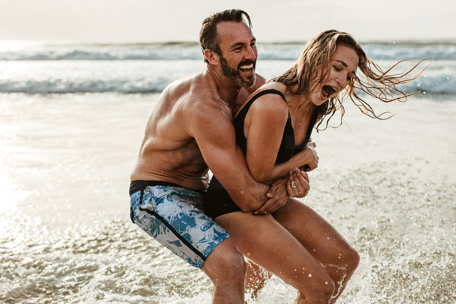 Playful couple having fun on their summer vacation. Man and woman playing on the beach.