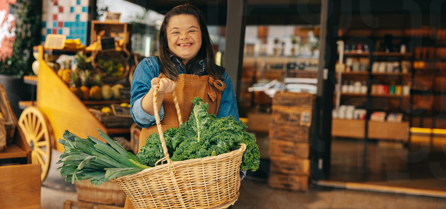 Grocery store employee with down syndrome holding a basket of fresh vegetables