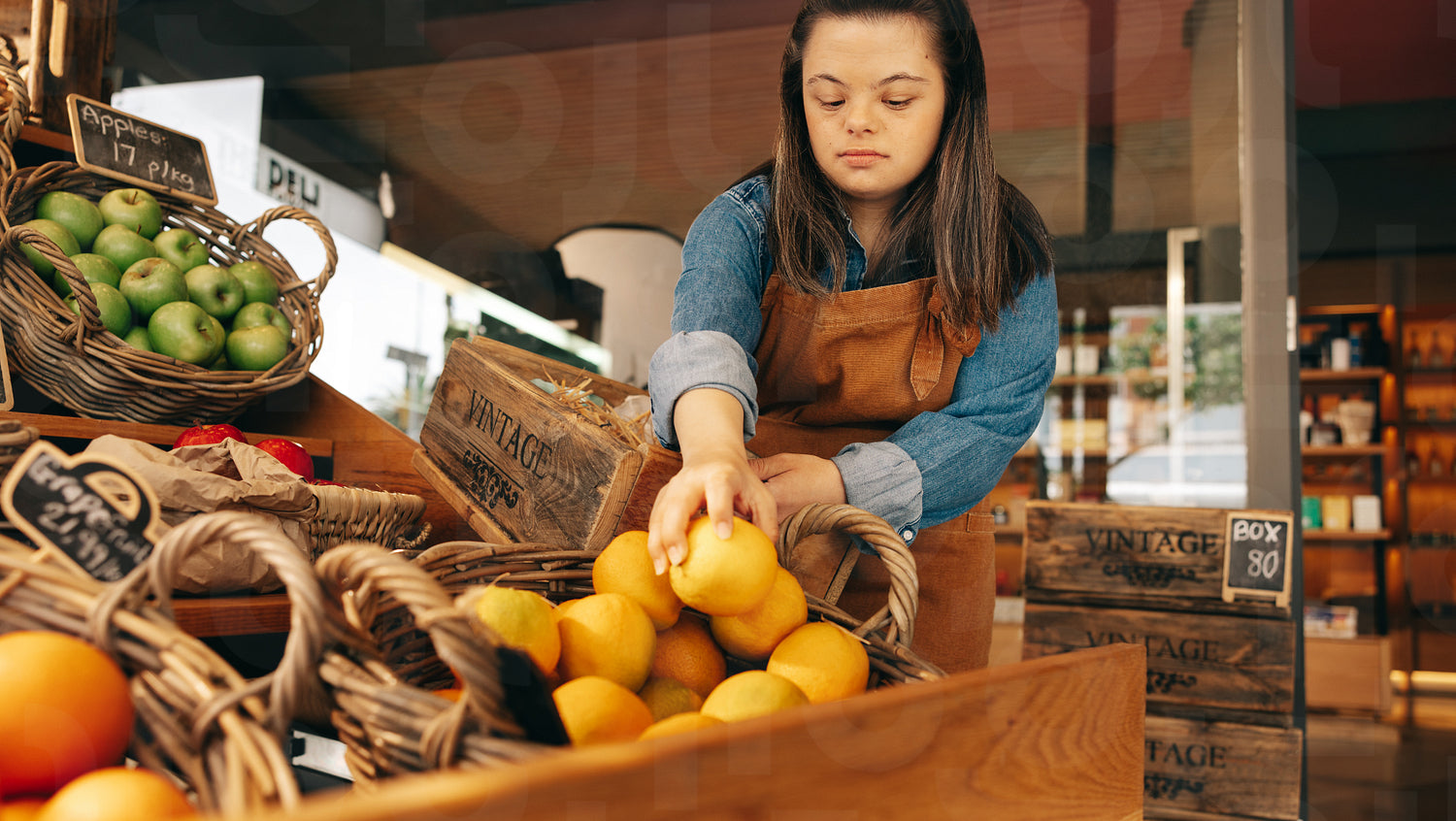 Grocery store employee with Down syndrome restocking fresh fruits in the vegetable section of a grocery store. Empowered woman with an intellectual disabilityemployed at a local supermarket.