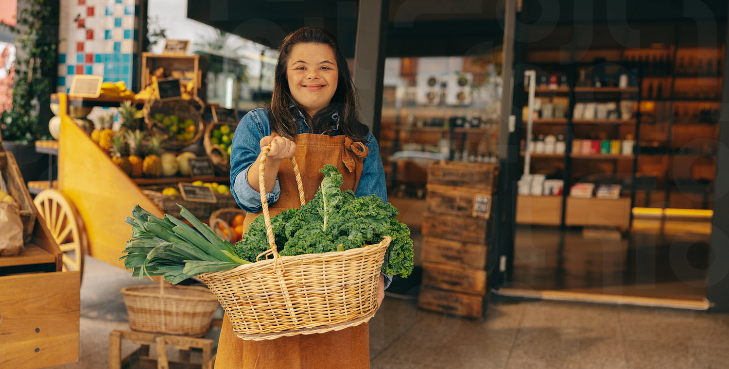 Shop employee with Down syndrome holding a basket of fresh organic vegetables