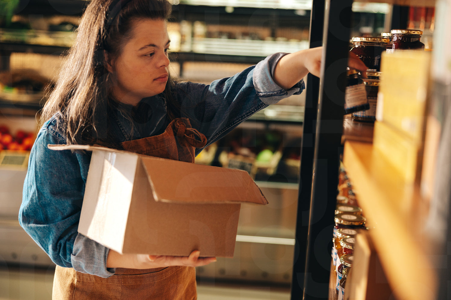 Supermarket employee with Down syndrome restocking food products onto the shop shelves. Empowered woman with an intellectual disability working as a shopkeeper in a grocery store.