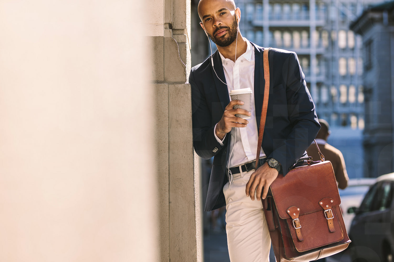 Portrait of handsome young man leaning to wall outdoors with coffee. African businessman with handbag wearing earphones and holding a cup of coffee.