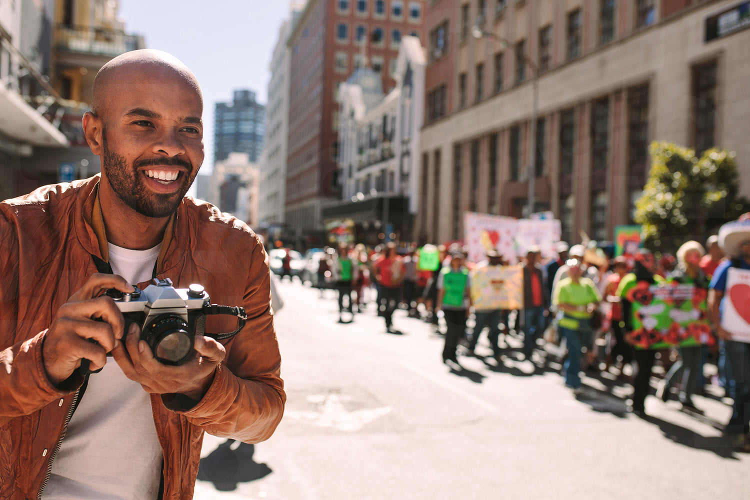 Smiling african photographer takes pictures of activists on road. Man taking photographs of people walking in a rally on city street.