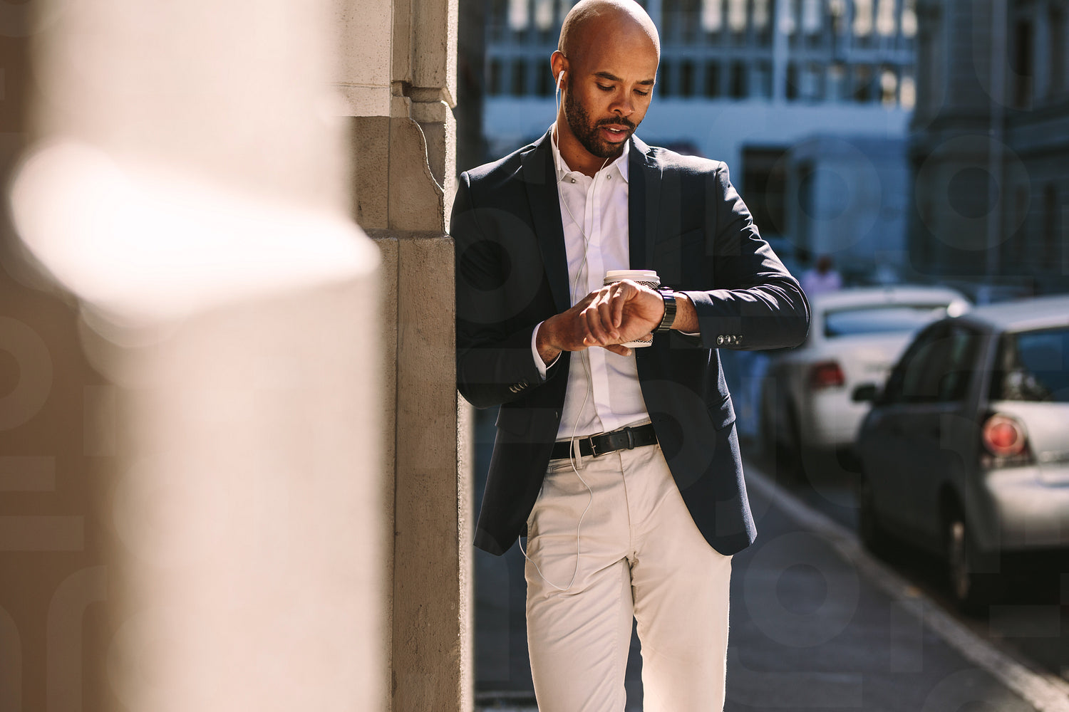 Young handsome businessman in suit watching time in his wristwatch. Businessman with coffee leaning to wall and checking time.
