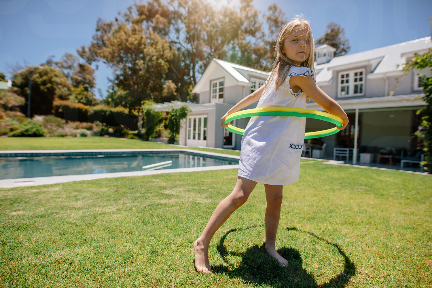 Full length shot of cute little girl playing with hula hoop in the backyard. Young girl playing outdoors on a summer day.
